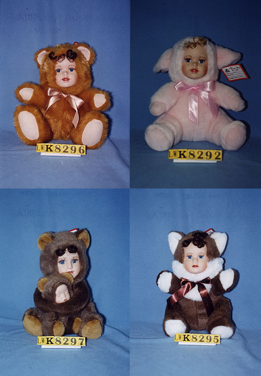 Porcelain animal doll with beautiful plush dress. Lovely face with curly hair.