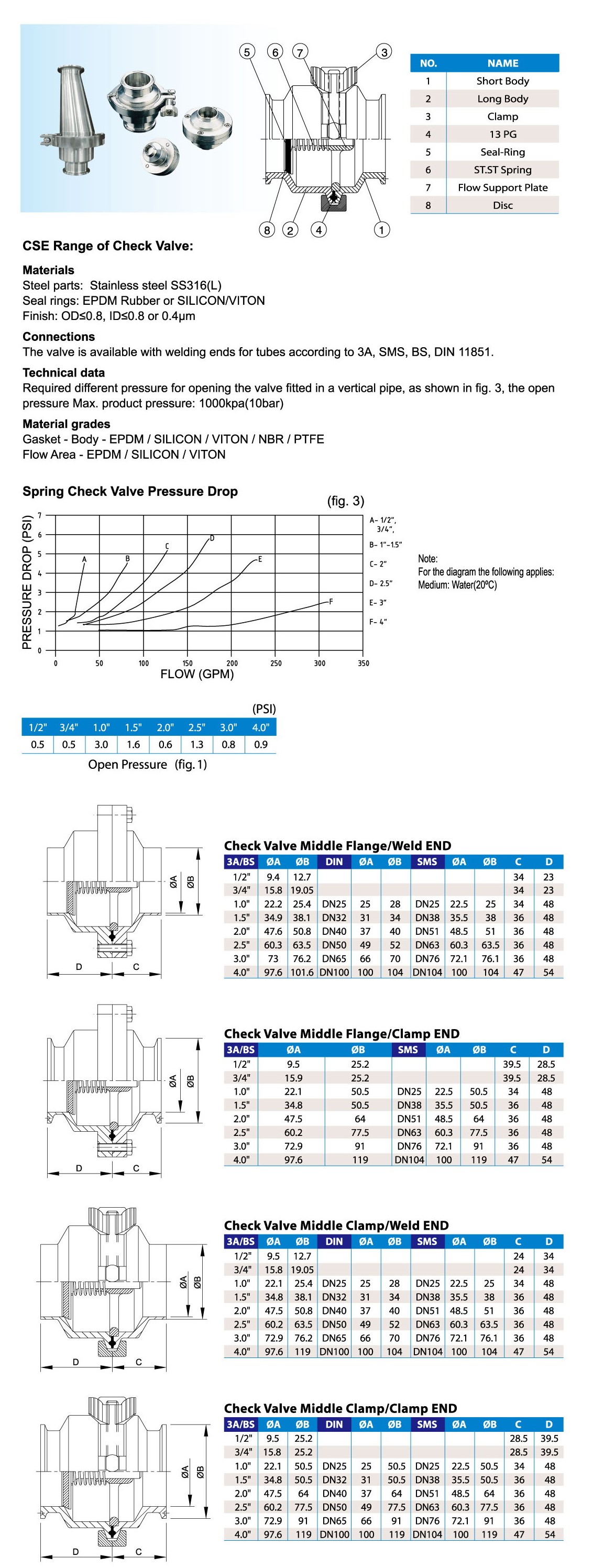 - 3A: Clamp, Weld, Bevel male and female are available from 1/2" up 4"