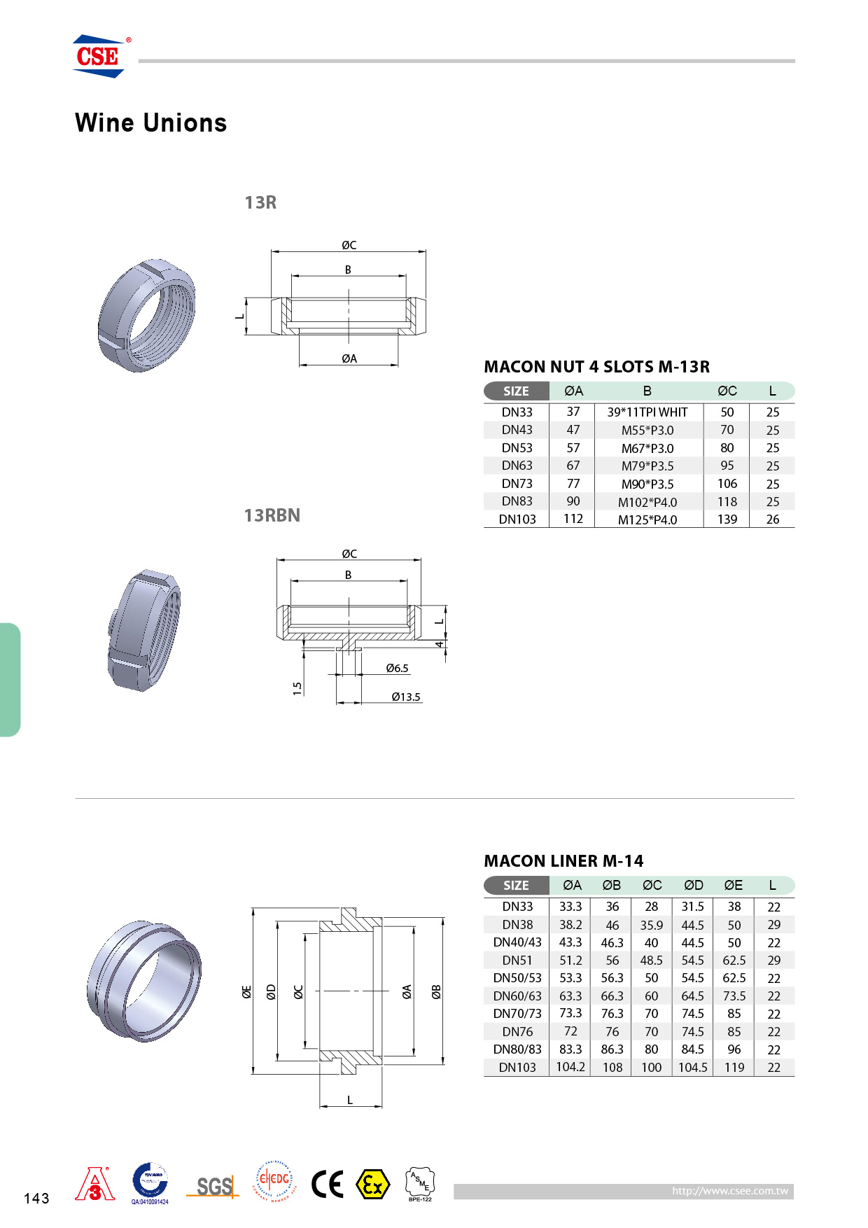 Wine complete unions are composed of WINE-13 NUT, WINE-14 WELD LINER PART, WINE-15 MALE PART AND SEAL.