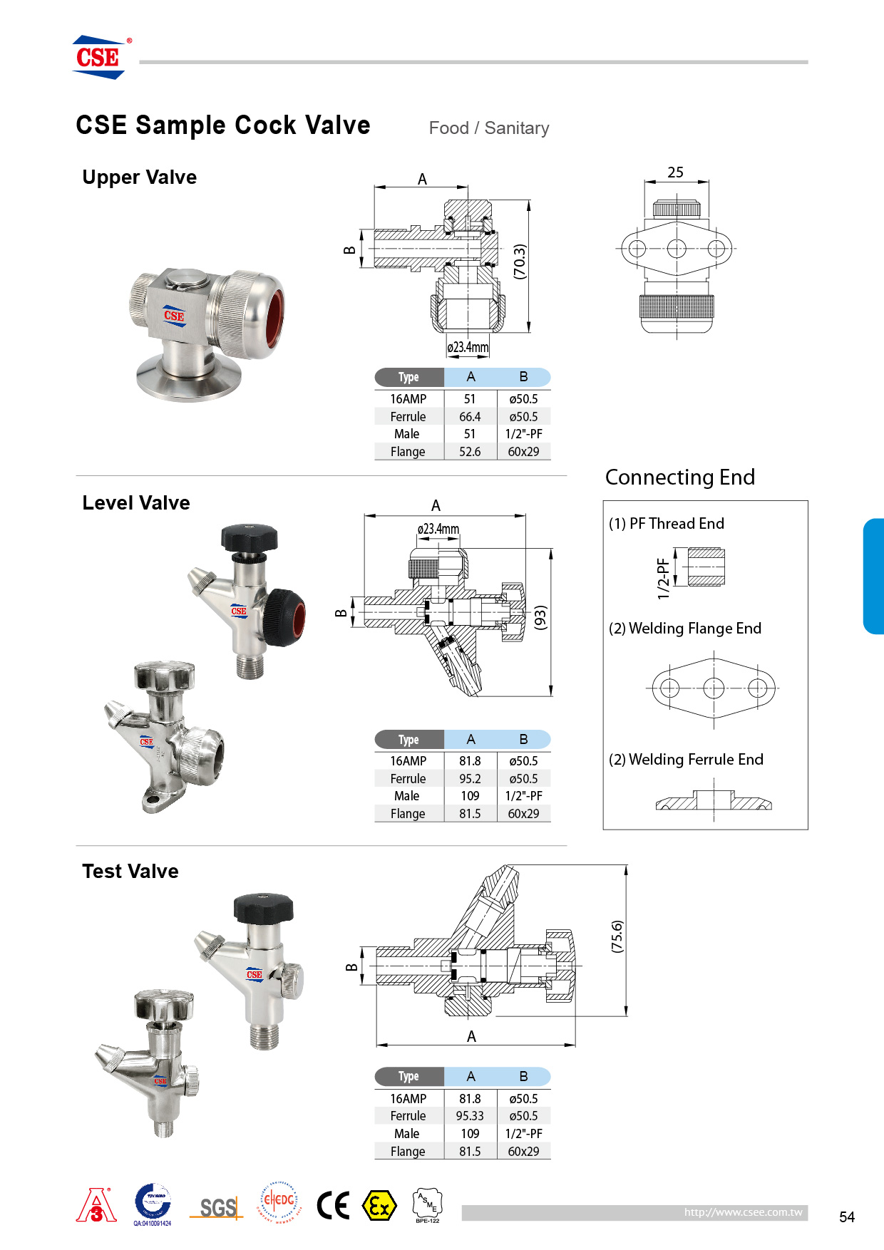 CSE aseptic sampling Cock Valve can be widely use for various industries. At this stage, the requirements for food hygiene and safety are gradually strict, especially baby food. Therefore, CSE has designed sampling cock valves to meet the requirement of the food, dairy, and beverage industries. The material can be 304/316L, and the outer and inner surfaces can be mechanically polished on request. It can be installed on the pipeline or storage tank. CSE provides a variety of end connections, clamp, butt welding, thread, etc... Sanitary sampling cock valves can draw fluids for partial testing and sampling, and are usually used for identification, quality control, and regulatory evaluation purposes.