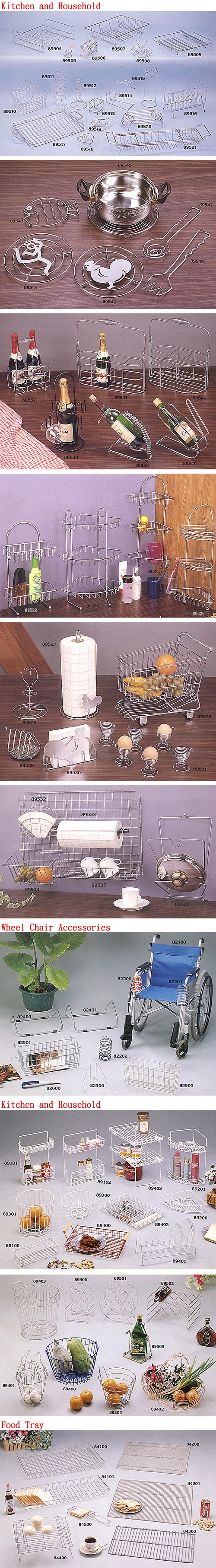 Dish drainers, trivet, wine bottle racks & baskets, fruit baskets, sandwich holders, cake cooler, flying basket, egg baskets, B.B.Q. grid, napkin holders, tissue paper holder, shopping baskets, fork & knife tray, storage racks, lid racks, shower caddy, wall hanging baskets, turkey holder, food tray, pet cages, wire cage doors, walker basket, pan holder, clip-glass holder, wire frame book holder.
