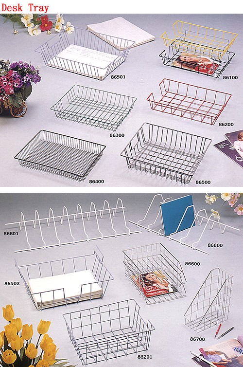 Document tray, printer basket, file racks, magazine racks.