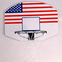 46cm diameter steel ring with mounting plate. Official size and weight, nylon wound rubber ball. Complete with inflation adapter. "Stars and Stripes" design, weatherproofed backboard with target area. Backboard (W) 79, (L) 58cm. Is pre-drilled for ring. Complete with instructions and fixings.
