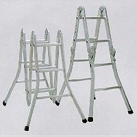 This 4-section folding ladder is made of high-tension aluminum and is equipped with 3 pairs of safety auto-latching hinge systems. The ladder is built with box-type side rails and extra large serrated rungs and flared legs on both sides. This ladder can be used in various configurations such as a stepladder, straight ladder, scaffold, stand-off ladder etc. Just flip the locking-lever on each hinge and straighten or fold it into the position needed for the task at hand. It can even be used as a platform on uneven surfaces, such as stairs, low walls or ledges. This ladder is approved by TUV according to European standard EN 131.