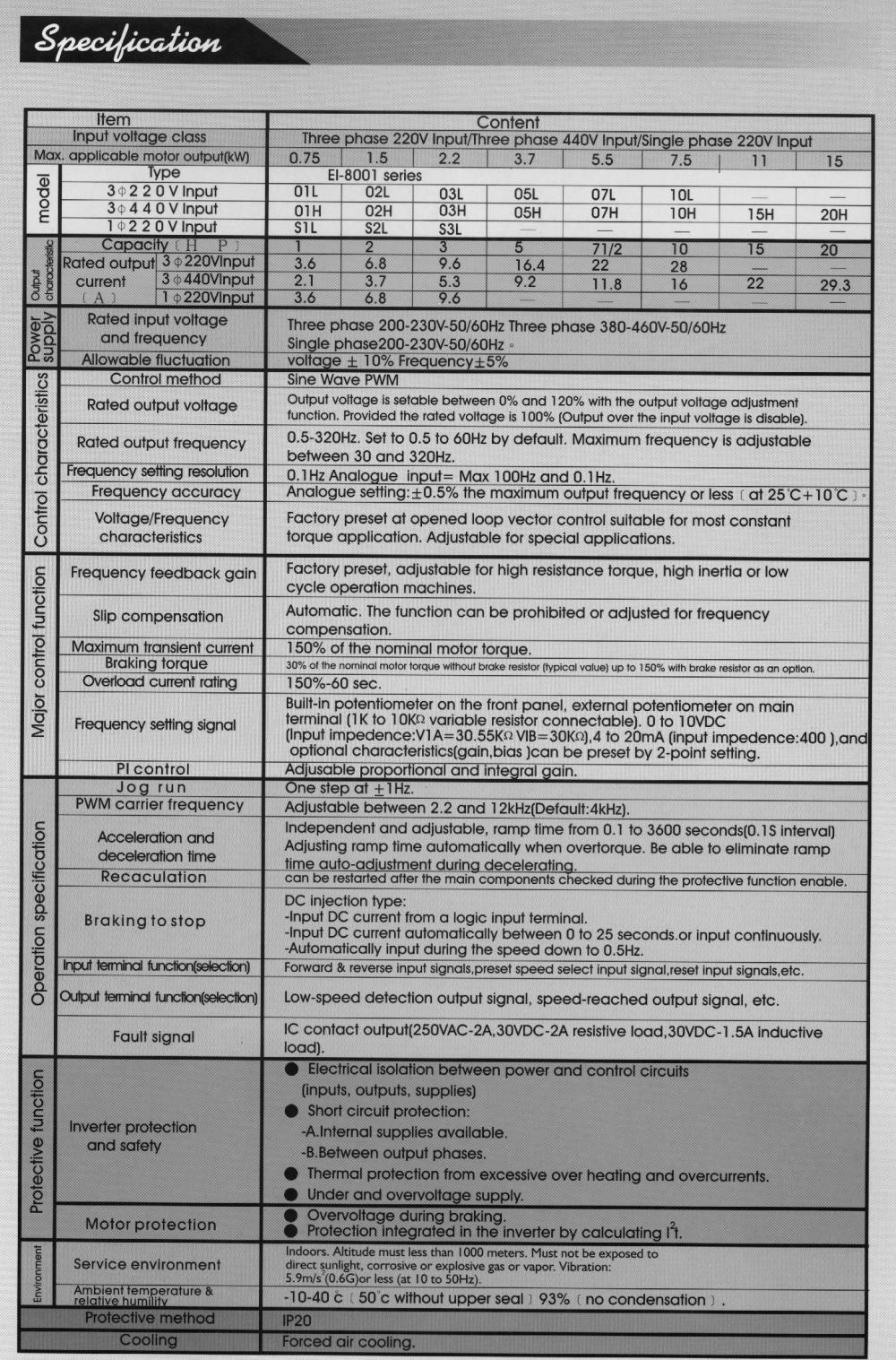 Sensorless Vector Control inverter(Specifications)