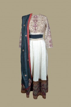 A exclusive and gorgeous ethical pick for this occasion time is this beautiful off white lengha with zardosi and marodi work the the bottom hem. This is beautifully paired with the zardosi work blouse and a contrasting dupatta. All the motifs of the ensemble is inspired from the baroque era.