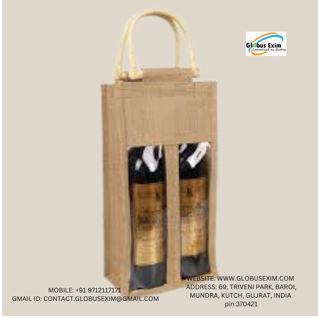 Laminated, printing customization, eco friendly, reusable, durable, jute bottle bag with handles.