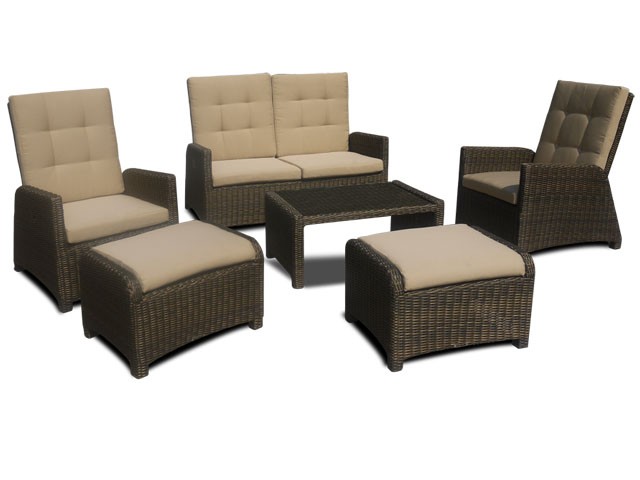 FIJI Recliner Conversation Set comes in sophisticated mixed golden & brown color with depth all weather 6mm half round brushed finish PE synthetic wicker HAND WOVEN on rust resistant powder coated aluminum frame fitted with rugged pump action mechanical lever on the side of the chair to allow reclining position. The chairs are covered with elegant khaki color cushions made with durable, sun resistant, fade resistant, low maintenance 100% polyester fabric. The coffee table is protected with 5 mm tempered glass top for optimum utility.