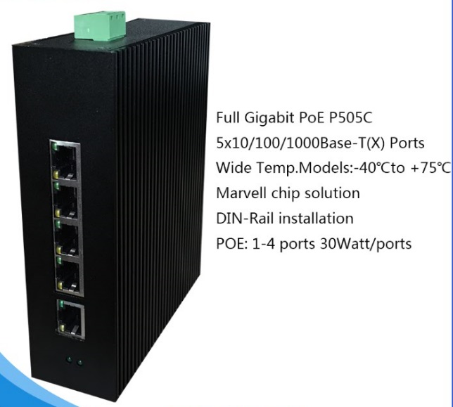 P505C Full Gigabit Unmanaged PoE Industrial Ethernet Switches are equipped with 5 Gigabit Ethernet ports, and up to 4 PoE ports, making them ideal for applications that demand high bandwidth.