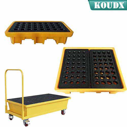 KOUDX Poly spill pallet is made of polyethylene, these pallets resist chemical attack from hazardous acids, caustics, and solvents. Seamless construction eliminates leaks. The high-strength mobile and removable grate is easy to remove, clean and replace. Liquid in the sump can be discharged through the drainage hole.