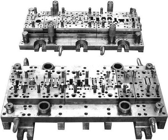 The progressive stamping die is placed into a reciprocating stamping press. As the press moves up, the top die moves with it, which allows the material to feed. When the press moves down, the die closes and performs the stamping operation. With each stroke of the press, a completed part is removed from the die.