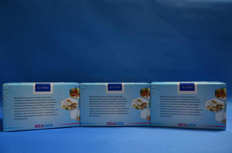 REAGEN™ Kanamycin ELISA Test Kit is based on a competitive colorimetric ELISA assay. The toxin of interest has been coated in the plate wells. During the analysis, sample is added along with the enzyme-conjugate and primary antibody specific for the target toxin. If the target is present in the sample, it will compete for the antibody, thereby preventing the antibody from binding to the toxin attached to the well. The enzyme-conjugate, will bined with the primary antibody that is complexed to the toxin coated on the plate wells. The resulting color intensity, after addition of substrate, has an inverse relationship with the target concentration in the sample.
