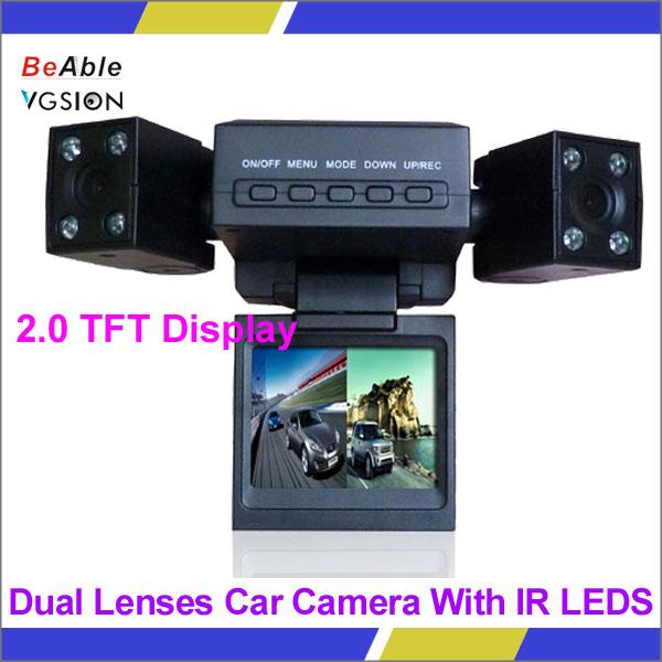 Built with two cameras & 2.0 TFT display Each camera can be 180 degrees rotation Two pictures can be shown on the display at the time Each camera can work separately Two cameras can work at the same time Video size: 1280 * 480 Picture size: 2560 * 1920 DVR will start to record automatically,when connect to the car charger Support night vision recording with 8 pcs IR LEDs Support cycle recording