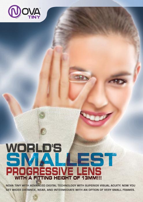 The World’s smallest progressive lenses in the World with a fitting height of 13mm .Now you do not need to compromise in aesthetics just because you are now 40+. At 13mm, Nova Tiny gives you the lowest recommended minimum fitting height of any leading short-corridor progressive lens. That means you can now fit your progressive lens patients in a wider selection of frames with outstanding visual performance. Nova Tiny revolutionary 9mm corridor deliver, Unsurpassed full-power reading vision in small and ultra-small frames. Soft, smooth geometry for greater viewing comfort and easier adaptation. Carefully controlled astigmatism for excellent binocular vision. Low skew distortion for comfortable dynamic vision.