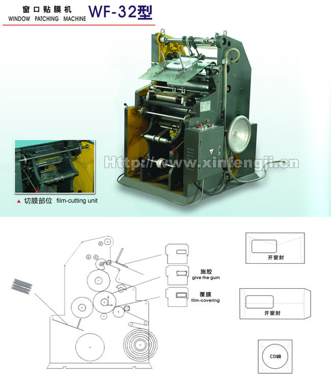 WF-32 Model Automatic Window Patching Machine is applied to patch the film on the opened window. It can produce all kinds of international and domestic standard envelopes and flat bags. It can not only be together used with ZF260 model, WF-53 model, but also can be together used with all kinds of western style machines. WF-32 model is characterized by its high efficiency, stable function, easy operation, quick adjustment. It's suitable for mass production jobs of large quantity.