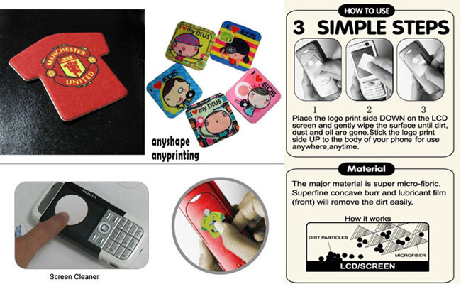 1). Microfiber Screen Cleaner and Sticky Microfiber Screen Cleaner used to decrative the mobile phone,and can use to cleaning mobile phones screen,carmera,good for promotion gifts.
