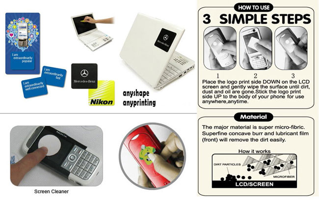 1). Microfiber Screen Cleaner and Sticky Microfiber Screen Cleaner used to decrative the mobile phone,and can use to cleaning mobile phones screen,carmera,good for promotion gifts.