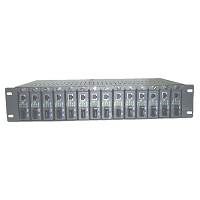 The Media Converter Rack, MCR-1400 is designed to accommodate fourteen separate and independent media converters within a rack-mountable chassis. The rack is fitted with two switching power supplies for enhanced reliability. This means that if one supply should fail, the other is capable of taking over immediately.