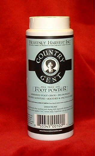 "Country Gent?Nonmedicated foot powder with tea tree and peppermint oils for the natural approach to inhibiting odor and soothing the feet. Tea Tree Oil is reported to be naturally antiseptic and antifungal. Peppermint Oil is warming and promotes circulation. Does not contain corn starch which when moistened forms crystals that can irritate feet and other body parts. Great follow up to "Country Gent" Medicated Foot Powder (Over-the-Counter Drug for the cure of Athlete's Foot) to prevent reoccurrence of Athlete's Foot. 4 ounce