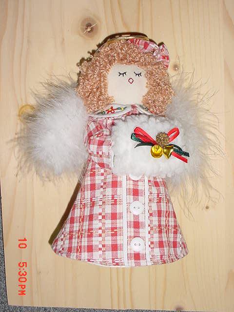 9" angel ornament w/white feather wings, cone-shaped body, brown hair, holding white warmer on hands