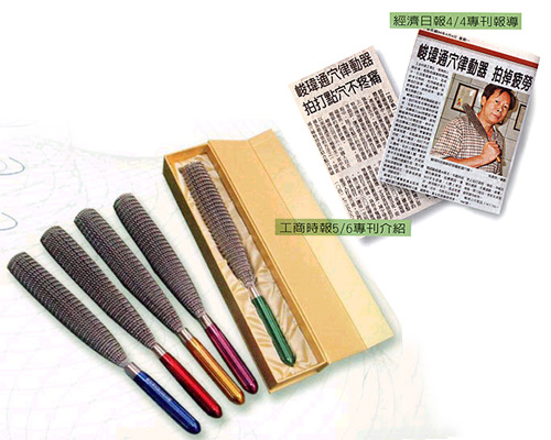 The spiral curve design has a shock absorbing effect. At the 1st instant time of taping, it creates a shock absorbing function to reduce painful feeling. At the 2nd instant time the spiral rods resiliently bend downward to reinforce the attacking force to the "hsueh" and effectively apply the tapping force on the human body to increase a cosy feeling.