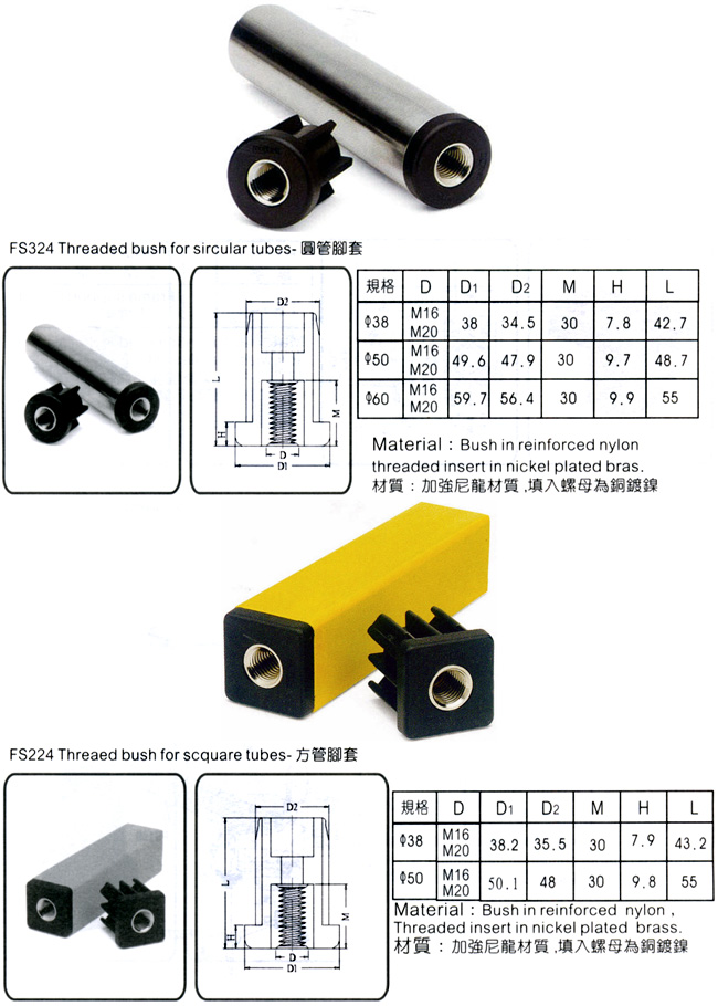 Material: Bush in reinforce nylon threaded insert in nickel plated brass.