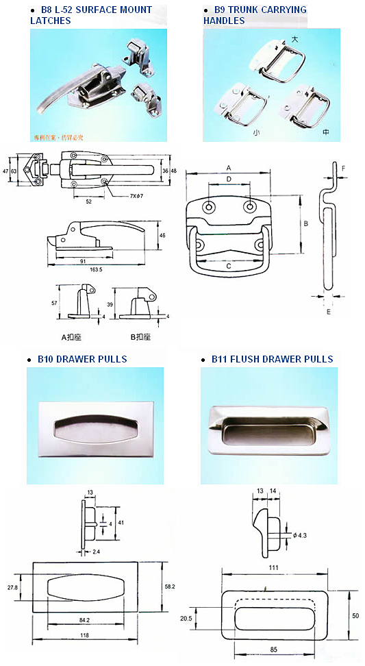SURFACE MOUNT LATCHES, TRUNK CARRYING HANDLES, DRAWER PULLS, FLUSH DRAWER PULLS