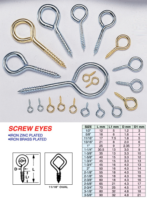 The screw eyes are commonly used to attach cables to objects. For example, they can attach a string to the back of a painting to allow the painting to hang from a nail on a wall. They are also called eye bolts, the screws with a loop on one end and threads on the other end. Screw eyes can be applied to hanging picture frames, kitchen utensils, gate hooks, workshop items, and party decorations.