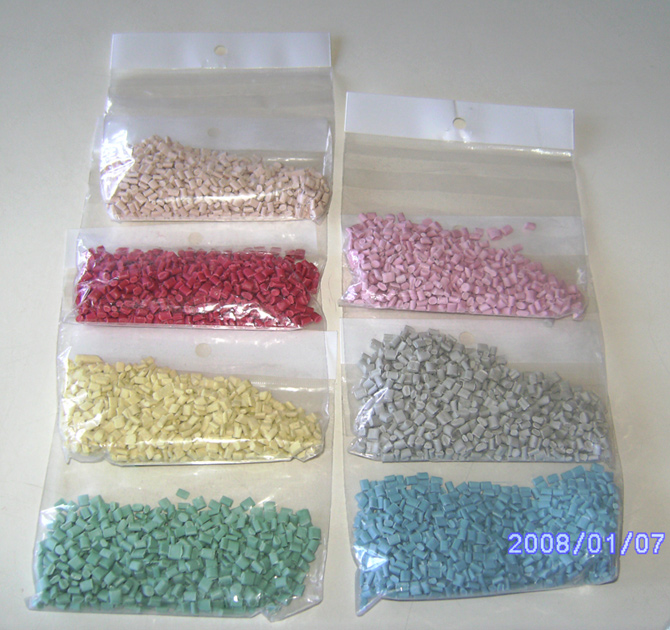 PP repro pellets in various light colors (pink, grey, red, blue, yellow, red, green).