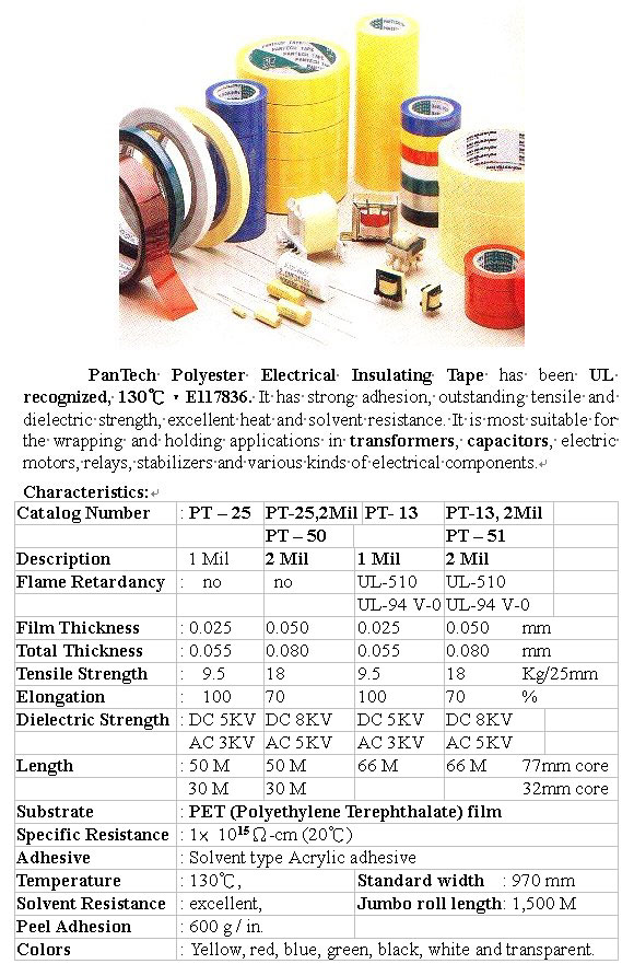 PanTech UL recognized Polyester Electrical Insulating Tape has strong adhesion, outstanding dielectric and tensile strength, excellent heat and solvent resistance. The flame retardant grade meets UL-510, (equivalent to UL-94 V-0), and the UL CTI Group I, 600V requirements. It is most suitable for the wrapping and holding applications in transformers, capacitors, electric motors, relays, stabilizers and various kinds of electrical components.