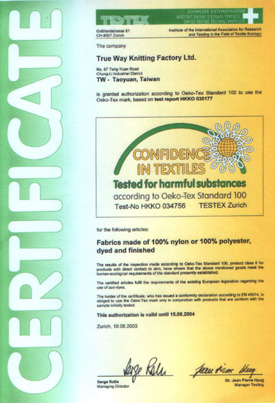 Our main textile company is granted authorization according to Oeko-Tex Standard 100 to use the Oeko-Tex mark, based on test report HKKO 043346
