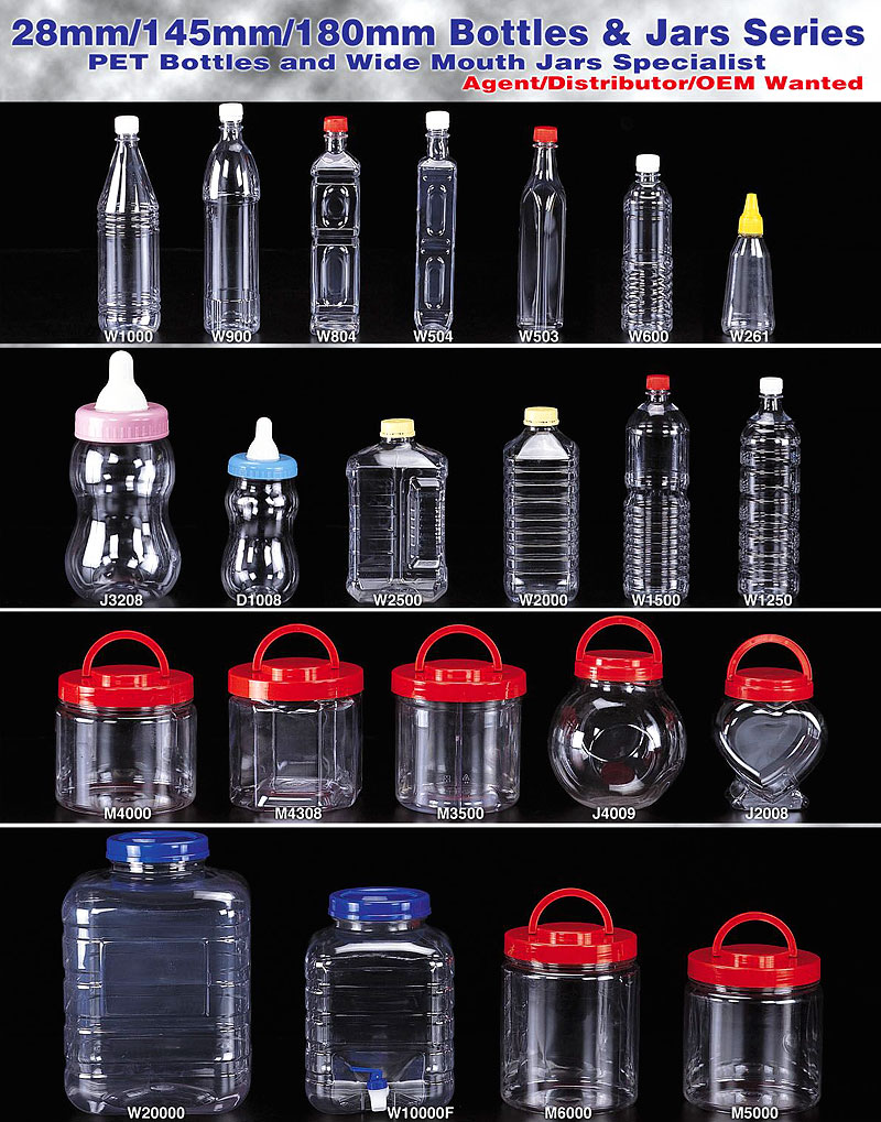 Clear 28mm / 145mm / 180mm – plastic containers - narrow neck bottle wide mouth plastic jars with PP closure ranging from 100CC to 5,000CC.