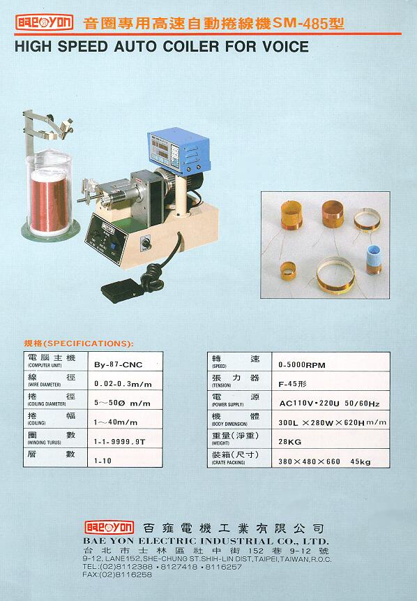 This is made of high-class steel, aluminium alloy body, all new series of special treatment, with compact appearance, convenient for moving, noiseless, less wear rate, easy for maintenance, and longest service life. It is available for high-speed running, equipped with gear setting type of turn counter, stepless adjustment for coiling width, and stop operation for ply number adjustment, so able to adjust coil size as desired, to save trouble for changing parts and to enhance the working economical efficiency. Its excellent electronic control circuit equipped with AC and DC motor makes the operator able to adjust the speed as desired. It is used with (West Germany made) originally packed electromagnetic brake, and designed with precision structure and special mold, to keep any size of coil uniform.
