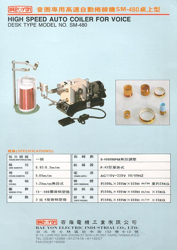 This is made of high-class steel, aluminium alloy body, all new series of special treatment, with compact appearance, convenient for moving, noiseless, less wear rate, easy for maintenance, and longest service life. It is available for high-speed running, equipped with gear setting type of turn counter, stepless adjustment for coiling width, and stop operation for ply number adjustment, so able to adjust coil size as desired, to save trouble for changing parts and to enhance the working economical efficiency. Its excellent electronic control circuit equipped with AC and DC motor makes the operator able to adjust the speed as desired. It is used with (West Germany made) originally packed electromagnetic brake, and designed with precision structure and special mold, to keep any size of coil uniform.