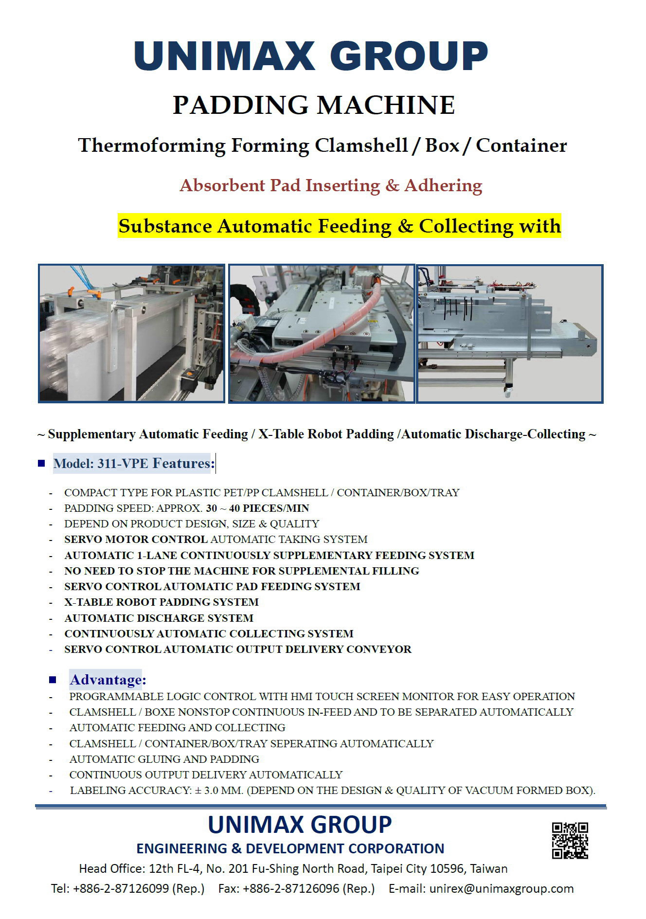 ■ 311-VPE Operation Speed: Approx. 25 ~ 30 ~ 40 Pieces/Min.■ 311-VPEE Operation Speed: Approx. 20 ~ 30 Pieces/Min. ♦ Equipped with Hot-Melt Glue Applicator. ♦ Equipped with Automatic Sticking-Padding System.♦ Padding Accuracy: ± 3.0 mm. - Depend on The Design & Quality of Thermorforming Product. • Pad Size: Max. 130~250 (L) * 100~160 (W) * 0.5~1 (T) mm. • Machine Size: Approx. 5,000 (L) * 1,000 (W) * 1,800 (H) mm.■ Economical Manual Feeding & Collecting Model 311-VPES Also Avalaible.Features