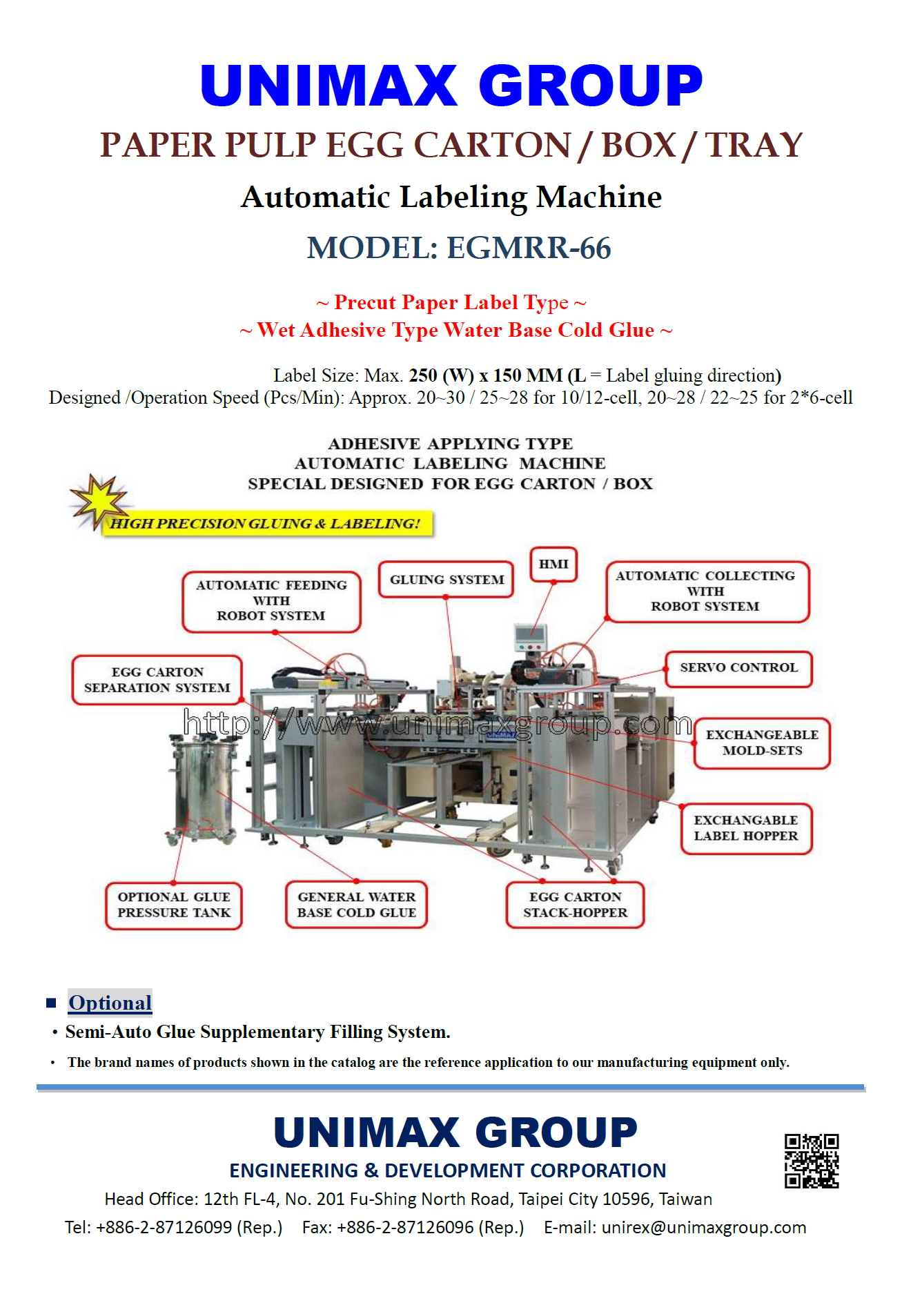 ♦ Function & Advantages: - Egg Cartons/Boxes/Trays Taking & Separating Automatically - Stacked Egg Trays Feeding Automatically - Egg Cartons/Boxes/Trays Automatic Transportation System - Products Position-Setting Automatically - Label Automatic Taking and Loading onto Egg Carton - Precisely Automatic Roller Gluing and Labeling - Labeled Cartons/Boxes/Trays Stacking in Receiving Stack-Hopper Automatically - Integrated Control X-Table Robot System - Equipped with Each 2 Sets Stack-Hopper Fixed Type - Egg Box / Carton / Tray Automatic Taking & Collecting ♦ Control System:- Programmable Logic Control System: Japan "Mitsubishi" PLC - Labeling System: Japan "YASKAWA" Servo Motor - HMI: Interfaced Control Touch Screen Monitor• Optional Hot-Melt Glue Labeling * The brand names of products shown in the catalogue are the reference application to our manufacturing equipment only.Main Products