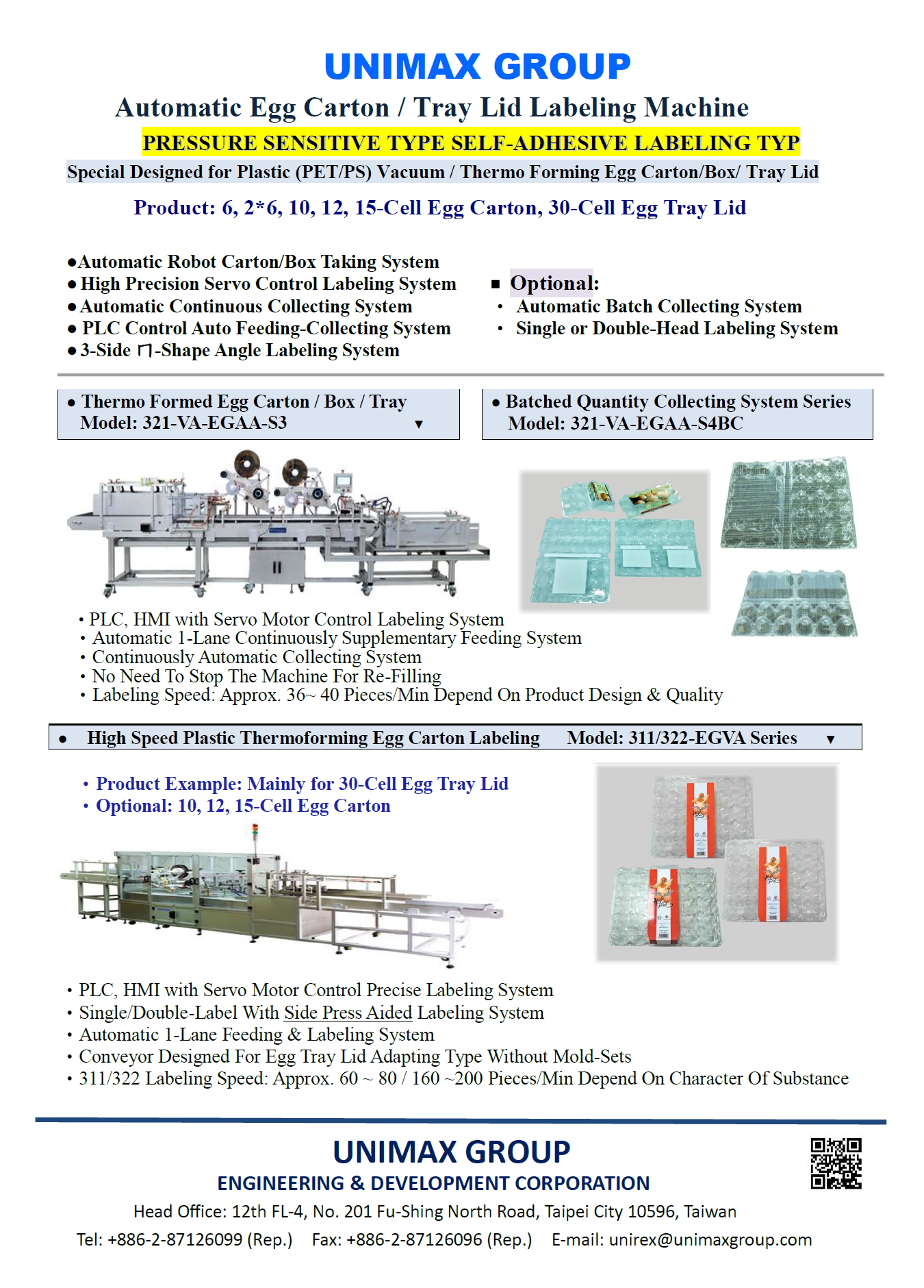 A) Self-Adhesive Labeling Series:- Plastic Vacuum/Thermoforming Egg Box/Carton/Tray Lid ■ Model: • 311-VA-EGAA-S3 / 311-VA-EGAA-S4 - Sophisticated and Practical Model for 1-Label Egg Carton/Tray Lid - 311-VA-EGAA-S3: Continuous Collecting - 311-VA-EGAA-S3: Quantitative Bulk Collecting - Designed / Operation Speed: Approx. 40~50 / 30~45 pcs/min • 321-VA-EGAA-S3 / 321-VA-EGAA-S4 - Sophisticated and Practical Model for 2-Label Egg Carton/Tray Lid - 321-VA-EGAA-S3: Continuous Collecting - 321-VA-EGAA-S4: Quantitative Bulk Collecting - Designed / Operation Speed: Approx. 40~50 / 30~45 pcs/min • 311-EGVA-S5HBC - High Speed Model for Egg Tray Lid, Optional for Carton. - Single-Labeling - Designed / Operation Speed (30-Cell Lid / 6, 10, 15-Cell Box): Approx. 100~80 / 80~60 pcs/min (30-Cell Lid) Approx. 80~60 / 60~40 pcs/min (6, 10, 15-Cell) • 322-EGVA-S7HBC - High Speed Model for Egg Tray Lid, Optional for Carton. - Double-Labeling - Designed / Operation Speed (30-Cell Lid / 6, 10, 15-Cell Box): Approx. 220~180 / 200~160 pcs/min (30-Cell Lid) Approx. 200~160 / 160~120 pcs/min (6, 10, 15-Cell) • 310-VS-EG-S1 / 320-VS-EG-S2 (For Egg Carton) - 310-VS-EG-S1: Economical Type, Single-Label for Egg Carton - 320-VS-EG-S2: Economical Type, Double-Label for Egg Carton - Feeding & Collecting by manual - Equipped with Egg box adapted transporting conveyor - Designed / Operation Speed: Approx. 35~45 / 30~40 pcs/min • 310-VS-EGMA (For Egg Carton) - Stack-Hopper Type, Single-Label for Egg Carton - Egg Carton Stack-Hopper Storage Feeding Type - Equipped with Mold-Sets - Designed / Operation Speed: Approx. 15~30 / 20~25 pcs/min(B) Precut Paper Label by Hot-melt Glue Roller Gluing Type - Plastic Thermoforming Egg Box/Carton/Tray Lid ♦ Die-Cut General Paper Label. ♦ Hot-melt Glue Roller Gluing & Labeling System ■ Model: EGVAC-66V: • Main Label Machine: Hot-melt Gluing Type 66-Series * 1 • Label Size: Max. 250 (W) x 150 MM (L = Label Gluing Direction). • Designed / Operation Speed: Approx. 25 ~30 / 22 ~ 27 Pieces/Min. ■ Model: EGDHLP-68V: • Main Label Machine: Hot-melt Gluing Type 68-Series *2 • Label Size: Max. 250 (W) x 220 MM (L = Label Gluing Direction). • Designed / Operation Speed: Approx. 60 ~70 / 55 ~ 60 Pieces/Min C). Label Insert Labeling Series: - Plastic Vacuum/Thermoforming Egg Box / Carton / Tray • 110-VA-EGAA-S4 - Automatic Label Inserting System - Automatic Feeding & Collecting - Continuous Supplementary Feeding System - Automatic Collecting System - Equipped with Hot-Melt Glue Applicator - Design /Operation Speed: Approx. 25~35 / 20~30 pcs/min.Features