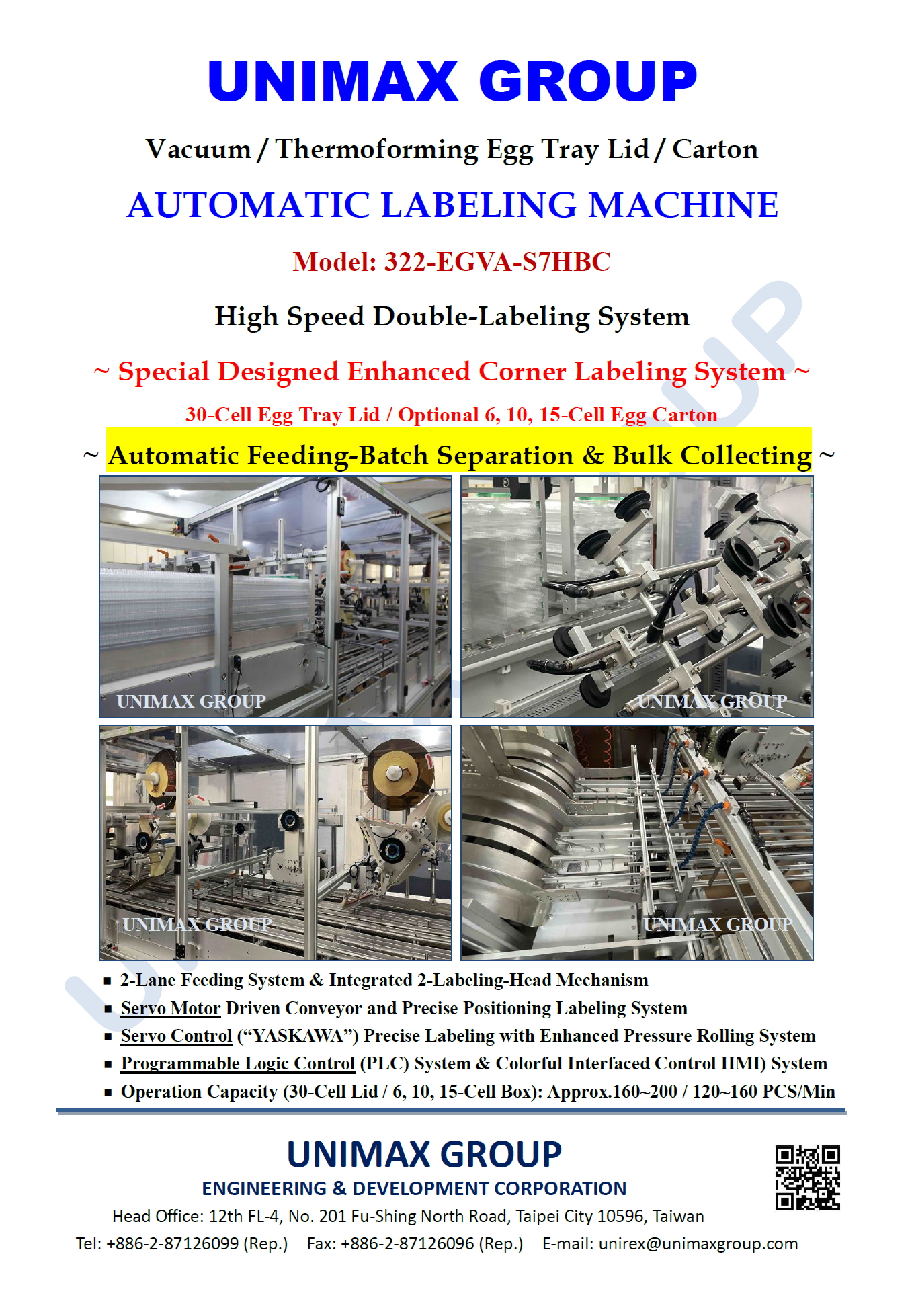 ■ Reference Labeling Speed: Approx. 160 ~ 200 Pieces/Min (30-Cell Egg Tray Lid) Approx. 120 ~ 160 Pieces/Min (6, 10, 15-Cell Egg Tray Lid) • Reference Labeling Product: Ma. Lay-Flat 245 (L) * 295 (W) mm. • Main Label: Max. 200 (L )* 120 (H) Included Base Paper. • Label Roll: ø 300 (O.D.) * 76 (I.D.) mm. • Machine Size: Approx. 8,450 (L) * 1,200 (W) * 1800 (H) mm.Features